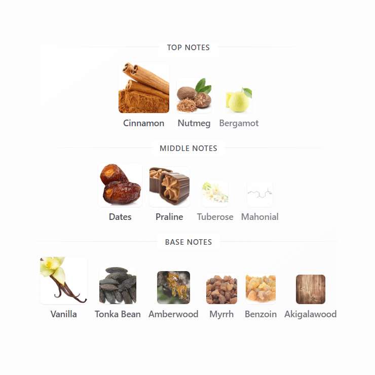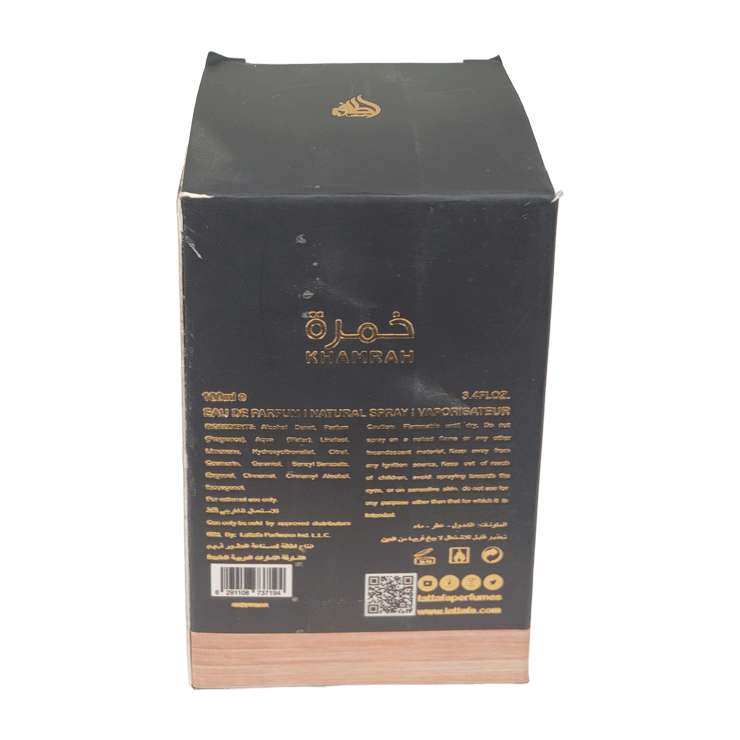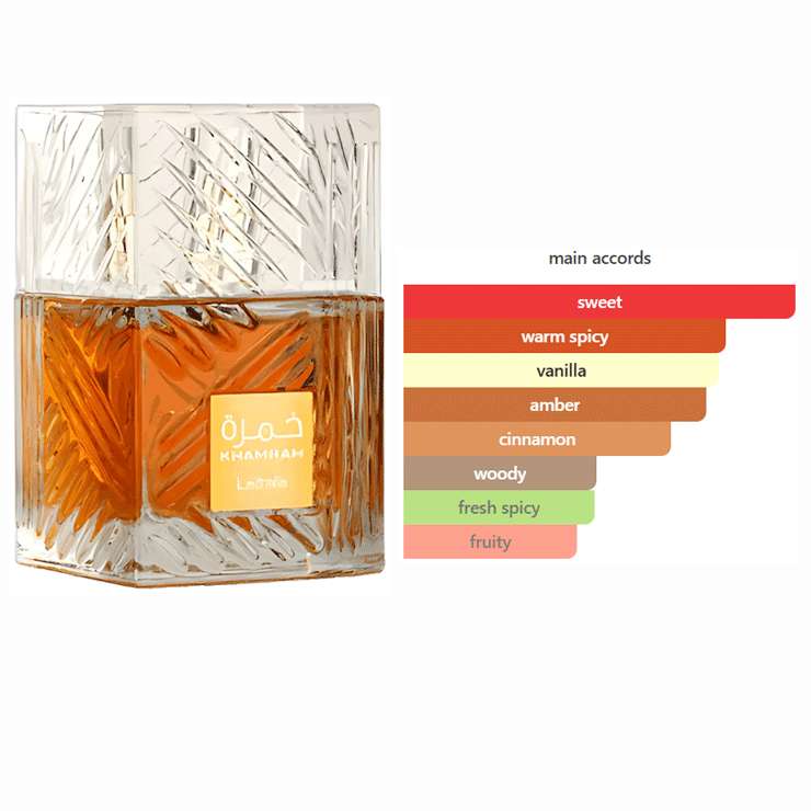 Khamrah by Lattafa Perfumes is a Oriental Spicy fragrance for women and men. Khamrah was launched in 2022. Top notes are Cinnamon, Nutmeg and Bergamot; middle notes are Dates, Praline, Tuberose and Mahonial; base notes are Vanilla, Tonka Bean, Amberwood, Myrrh, Benzoin and Akigalawood.